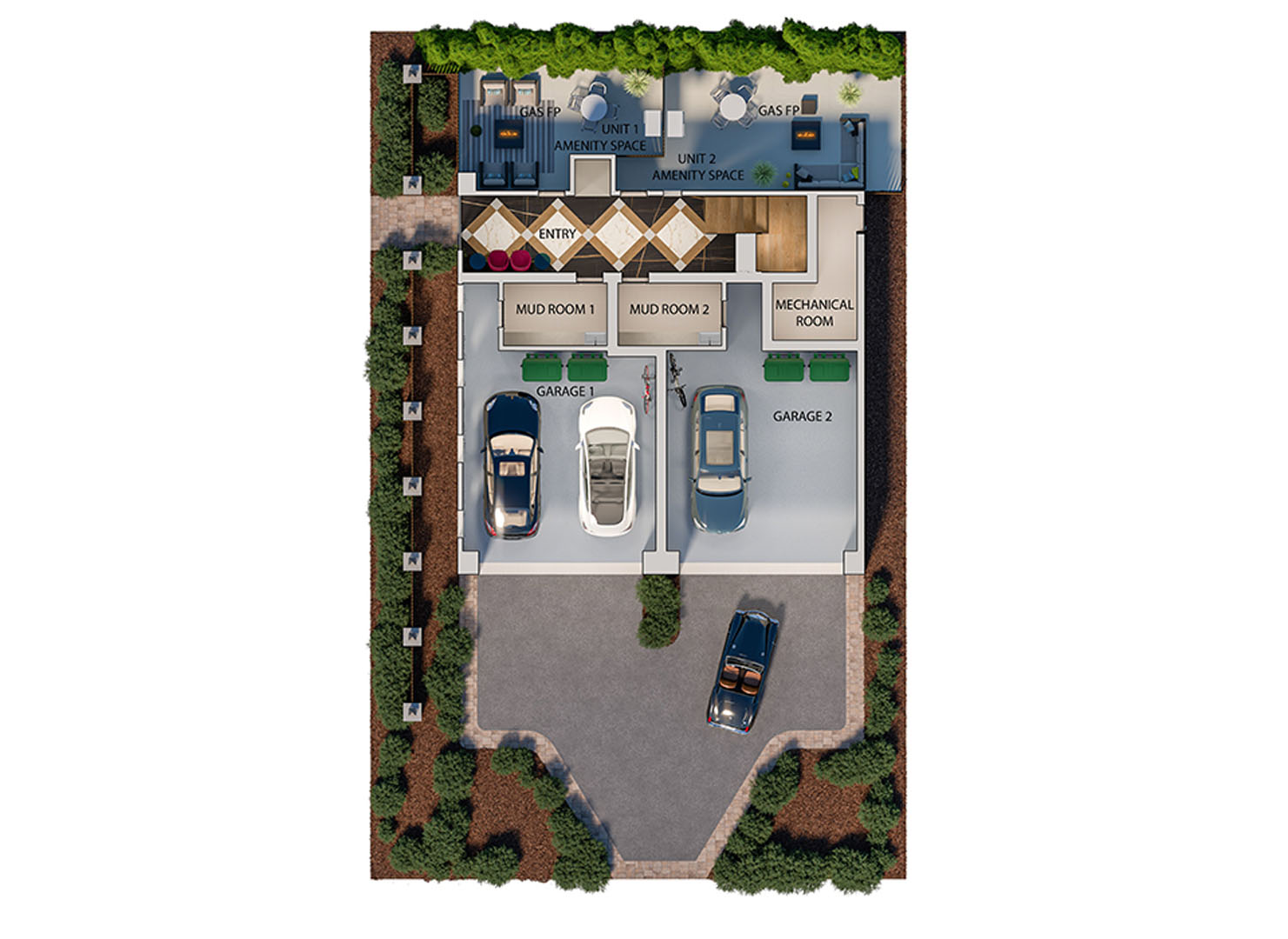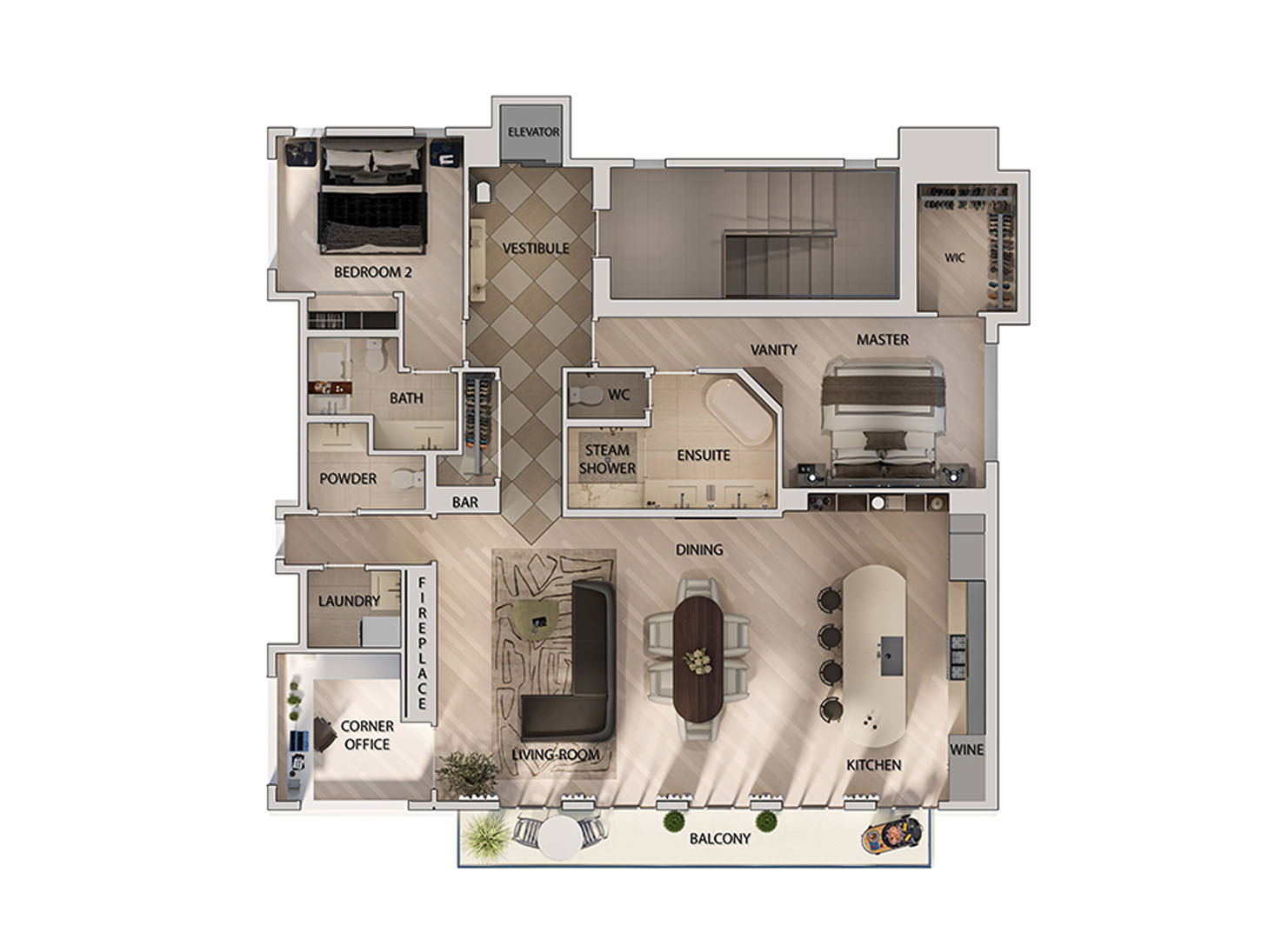 Each luxury residence occupies an entire floor, with private elevator access that opens into the unit. Defining features include 12 foot ceilings throughout, oversized arched windows, exclusive ground level patio with built in gas fireplace, and a secure double attached garage. In addition, there is a frameless glass balcony spanning 30 feet off of the main entertaining space, a 3 sided gas stone faced fireplace and bar in the living room, and an executive style corner office.